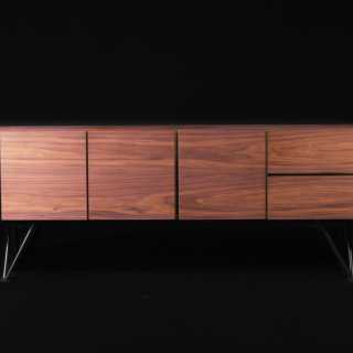 The Bennett Media Console is a modern luxury piece with hints of industrial trend and contemporary flare. A sleek, tailored design, Bennett is well suited for a sophisticated home that yearns for a touch of gold. Handsome American walnut veneer and characteristic black detailing balance confidence with mature subtlety. The Bennett Media Console is available in two sizes.