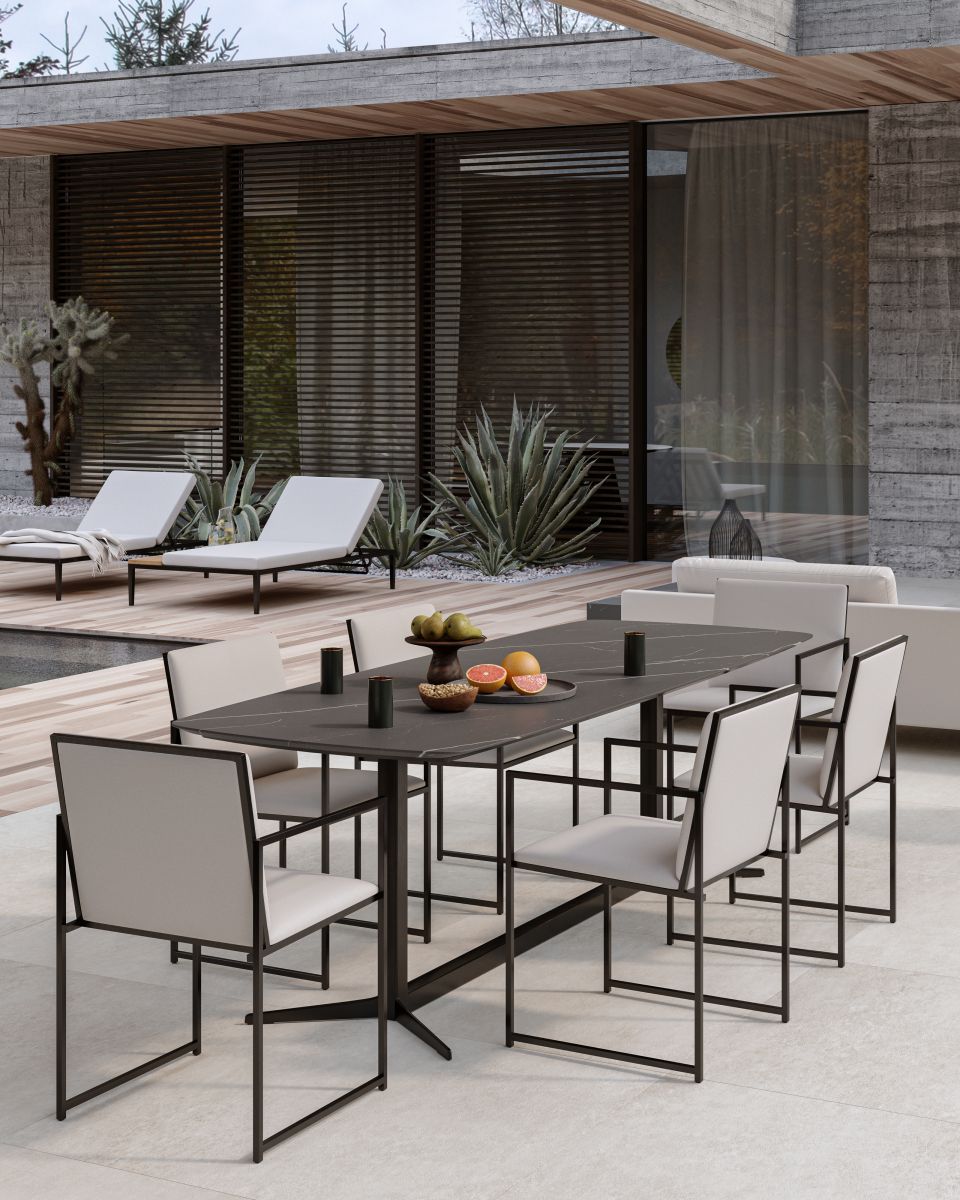 Choose an all-black outdoor dining table like the Elaine Outdoor Dining Table and pair it with a chair that features a cream-hued, water-resistant seat and black metal accents like the Parson Outdoor Dining Chair to create some contrast and elevate your outdoor dining space.