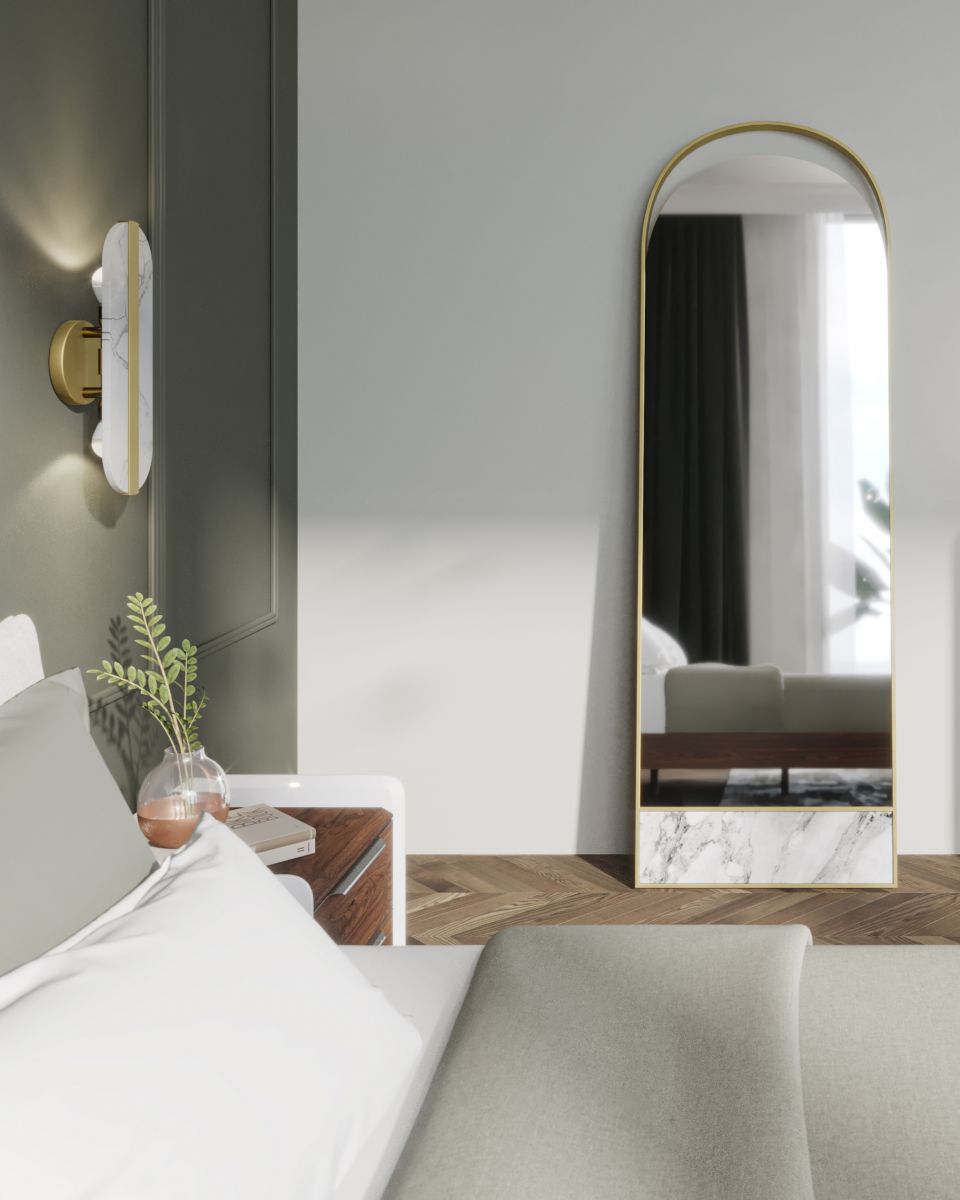 Opt for a contemporary mirror that also doubles as a piece of art to help strike a balance between style and function, like the Hudson Mirror. This full-length mirror is crafted from a delicate brushed metal frame and stunning marble base, not only is a beautiful accent piece but also opens up the room and gives the illusion of a grander space.