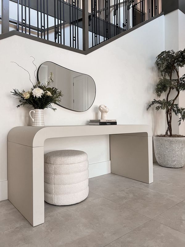 Create some visual interest in your entryway with a neutral console table in a natural material like the Cascadia Desk in Alabaster Concrete. Finish off the space with a round statement mirror with a minimal black metal frame like the Mila Mirror in Black Metal and an upholstered stool like the Nova Pouf in Pearl, Chatou Bouclé for a functional place to sit and take your shoes off.
