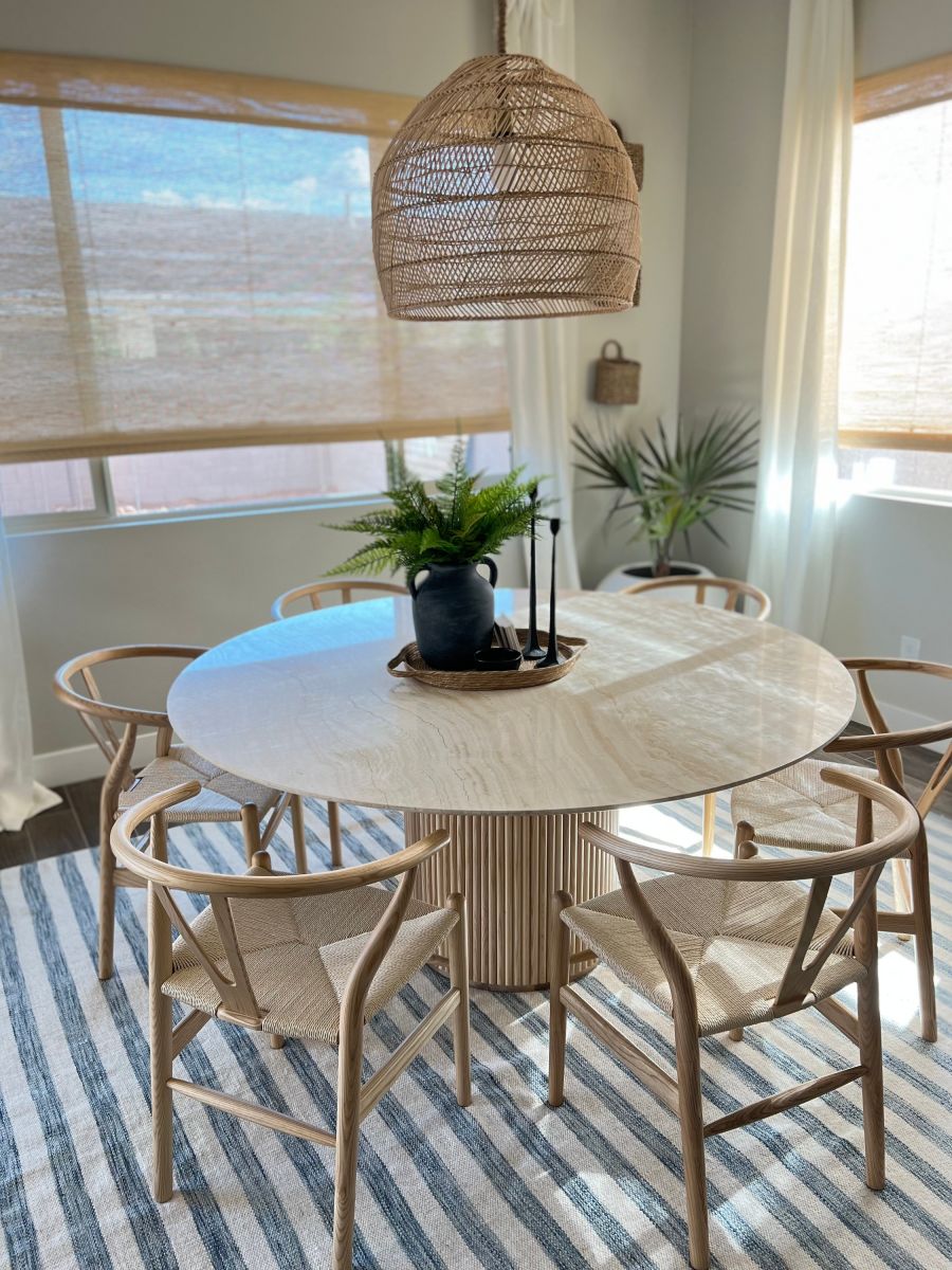 Incorporate a mix of different natural, sustainable materials in your dining space for an organic and serene space. Opt for a light-colored dining table that features a durable stone top with a tambour wood base like the Athena Round Dining Table in White Travertine and White Ash, paired with a woven wood dining chair like the Wishbone Chair in Natural with Natural Seat Cord for an elevated & sophisticated look.