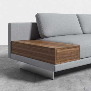 Compelling in its simple yet cutting edge style, the Dresden modular collection is a bold take on contemporary design. The sleek, low profile frame is met with grand cloud-like seat cushions to create the statement making structure. The Dresden also balances the expansive seating with an interchangeable side table insert that is offered in walnut, natural, and white lacquer finishes. Grounded on cast stainless steel legs with an elegant brushed finish, this piece's thoughtful composition demonstrates an exceptional opportunity for modern luxury in your home.