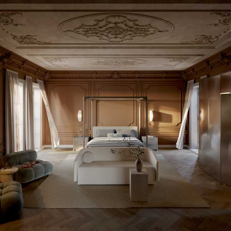 Step into a sanctuary where timeless architecture meets refined modernity. The Nerva Bed, framed by a sculptural canopy, anchors the space with quiet grandeur. Flanked by minimalist nightstands and bathed in natural light, it embodies a serene balance of form and function. The room’s warm paneling and soft textures invite a slow, intentional pace — a true retreat from the everyday.