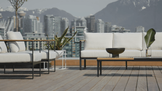 Dressed in structured lines and a durable black powder coated frame, the Louis Outdoor Loveseat embodies relaxed, coastal-inspired expressions. Designed with comfort and durability in mind, the Louis collection features fast dry foam cushions in cool toned UV resistant fabric and teak wood accents; perfect for turning any outdoor space into a modern sanctuary.