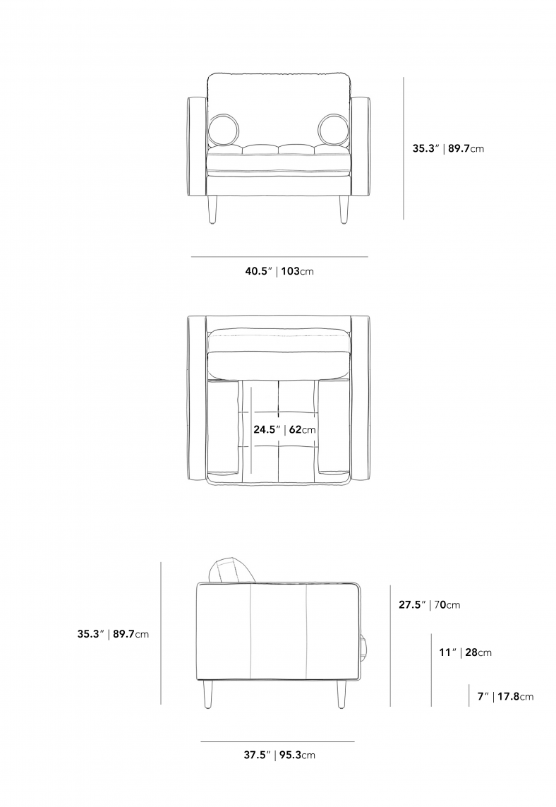 This statement armchair is styled with sleek tapered legs and contrasting lines. Luca seamlessly blends traditional design with modern trends using artisan techniques to produce characteristics such as beautiful piping along the edges and gentle tufting on the seat. Padded with a mixture of eco-friendly foam and premium goose feathers to create optimal firmness, while cylindrical side cushions add the finishing touch. Perfect design and comfort are met with custom upholstery options to match your home. Get the entire set with matching sofa and sectional.