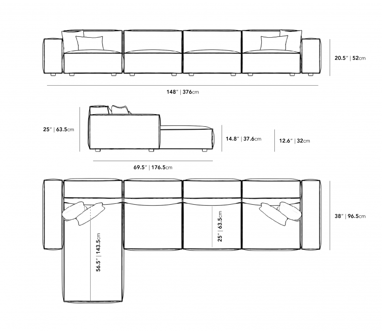 The Porter Extended Sectional is a simple structured sofa with boxy flare and a low-set profile. Square arm rests are made like a side table, while an elevated back rest provides ample lean-back support. High-density foam cushioning is nicely rounded and perfectly firm. Detailed pipe stitching around the edges finishes the eloquent modern design.