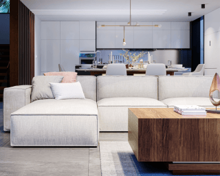 The Porter Sectional is a simple structured sofa with boxy flare and a low-set profile. Square arm rests are made like a side table, while an elevated back rest provides ample lean-back support. High-density foam cushioning is nicely rounded and perfectly firm. Detailed pipe stitching around the edges finishes the eloquent modern design.
