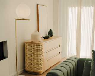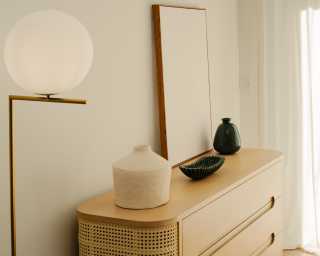 Delight in the sophisticated warmth of the Wishbone Dresser. Subtle yet elegant, the natural wood and cane detailing unites with the contemporary curves of this modern dresser to create a timeless balance in any bedroom.
